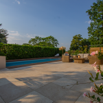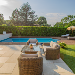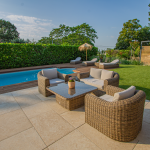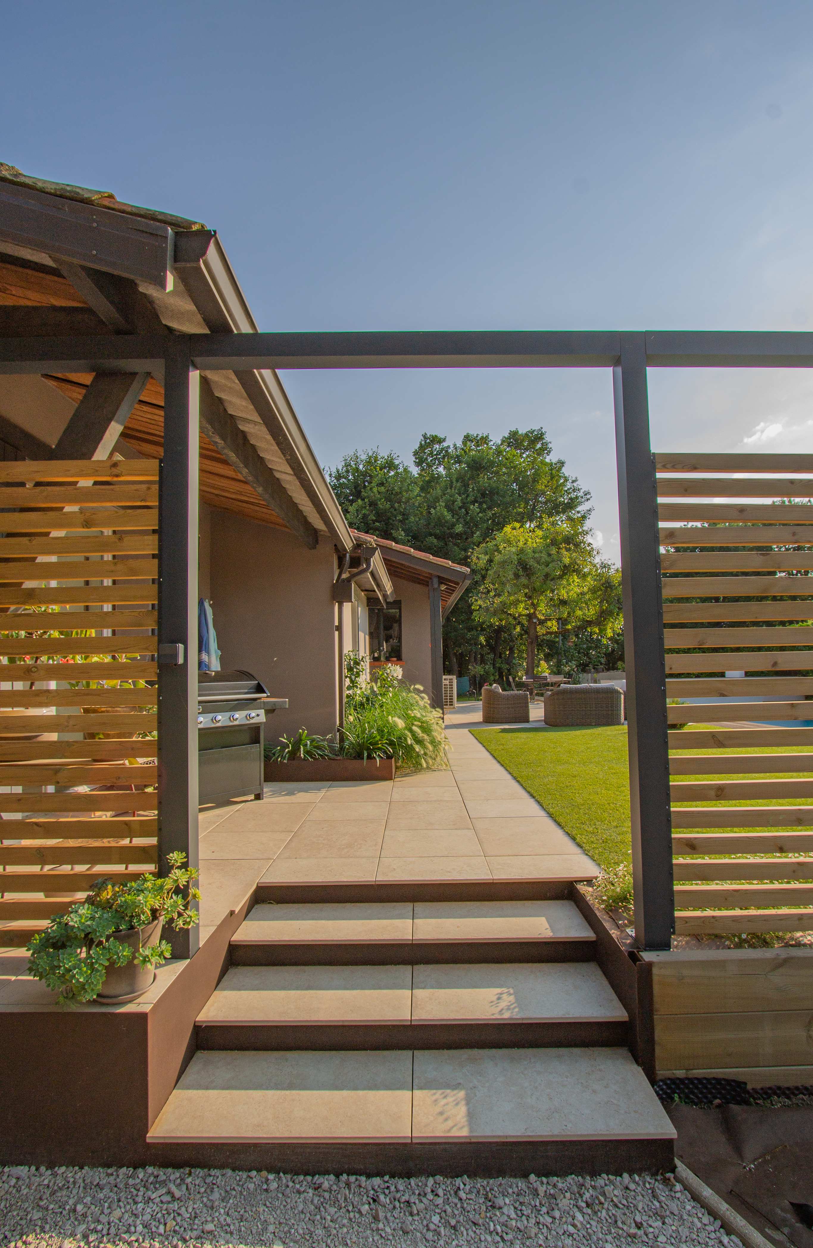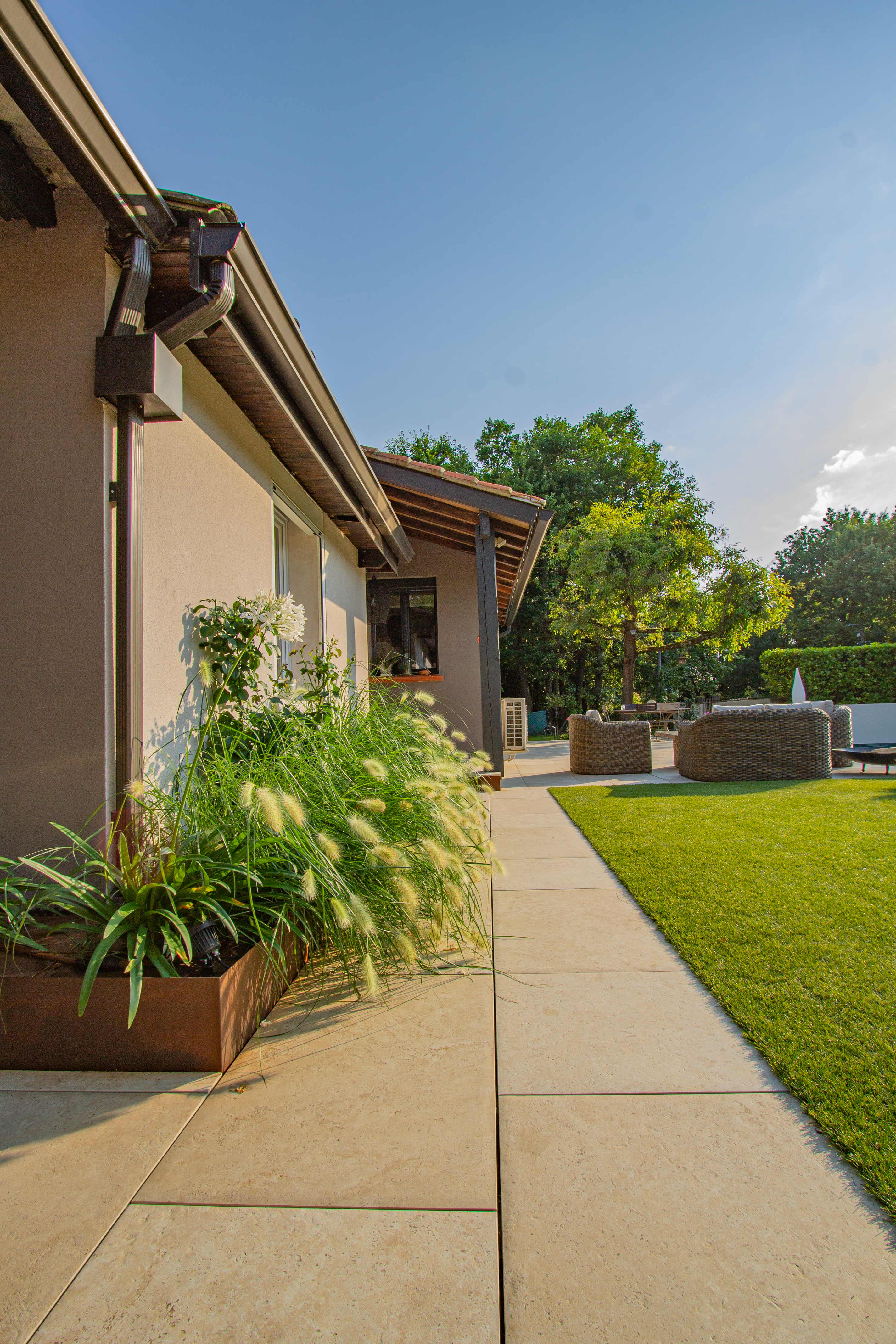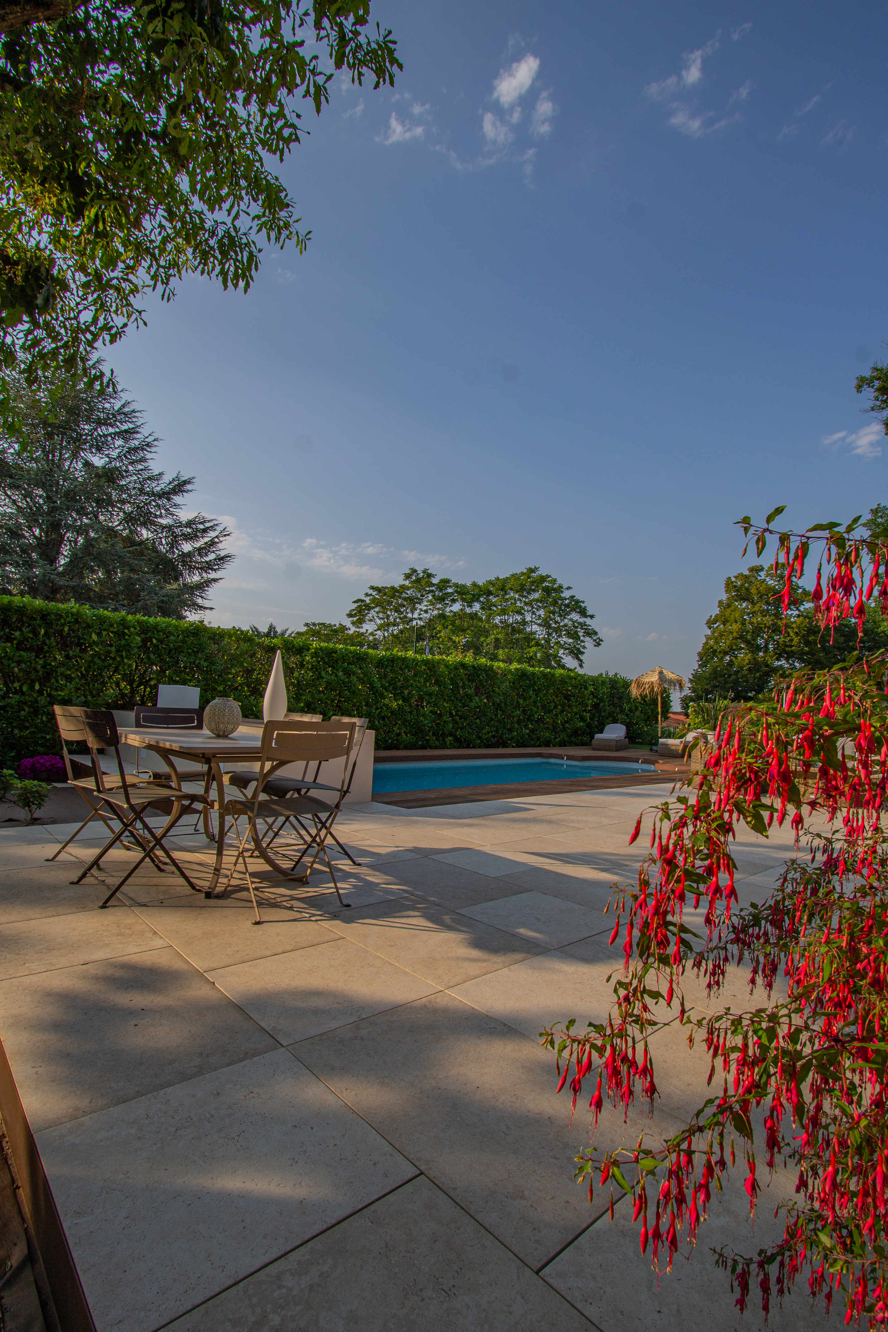 Nell’ambiente verde progettato da Kael CRÉATEUR DE JARDIN, le piastrelle della collezione Tiber gettano le basi per uno spazio conviviale. Le tonalità caratteristiche del travertino valorizzano la piscina e gli arredi esterni, creando un’area di sosta tanto bella quanto funzionale.