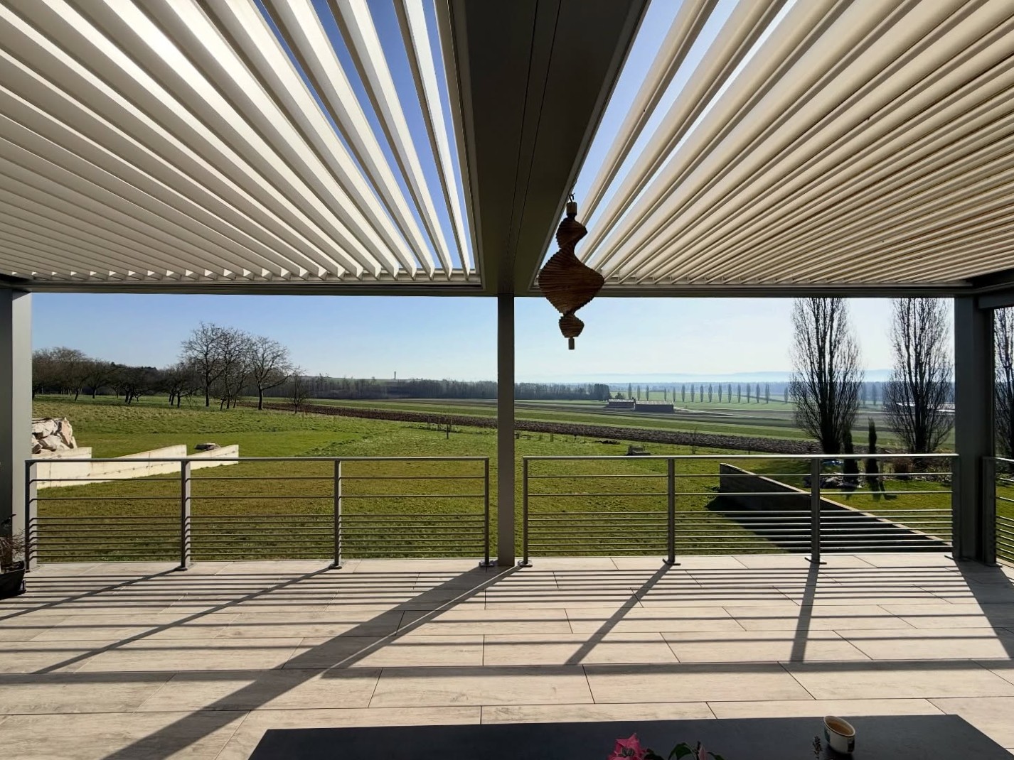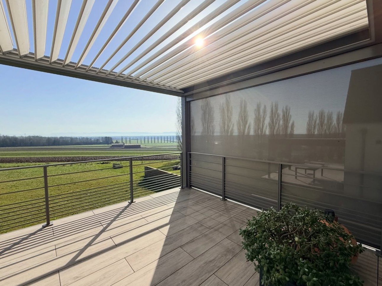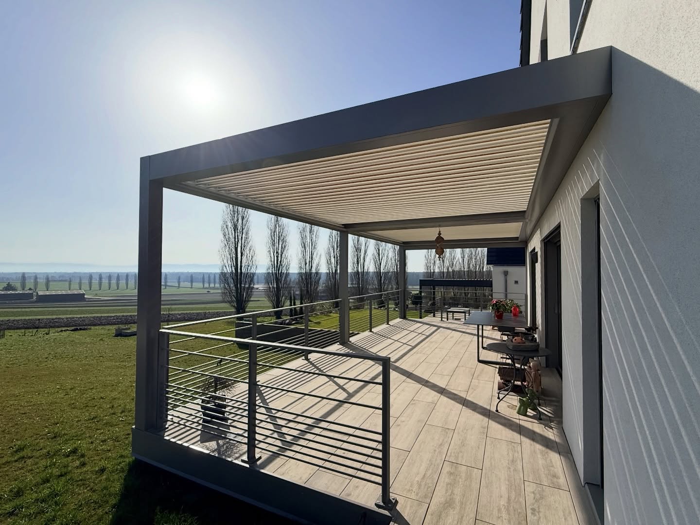 I proprietari hanno optato per una piastrellatura effetto legno per la terrazza. Questo rivestimento conferisce una morbidezza naturale che contrasta perfettamente con gli infissi grigio antracite e la pergola bioclimatica.