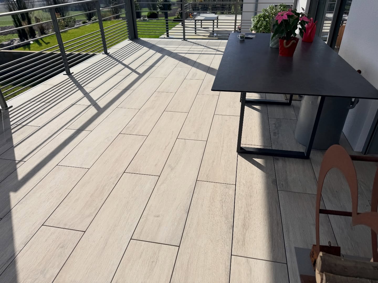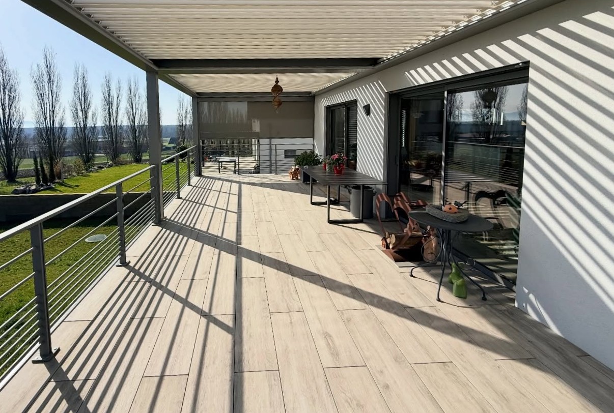 Questa terrazza, situata in una regione caratterizzata da forti sbalzi termici, richiedeva un rivestimento resistente a qualsiasi condizione. Utilizzando la tecnologia delle piastrelle per terrazze della gamma Outdoor Plus (lastre da 20 mm), la realizzazione garantisce una durata totale contro il gelo e i raggi UV, senza alcuna manutenzione impegnativa.