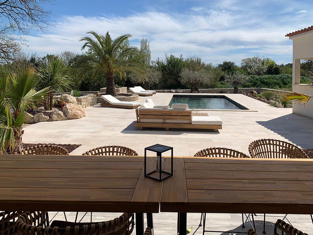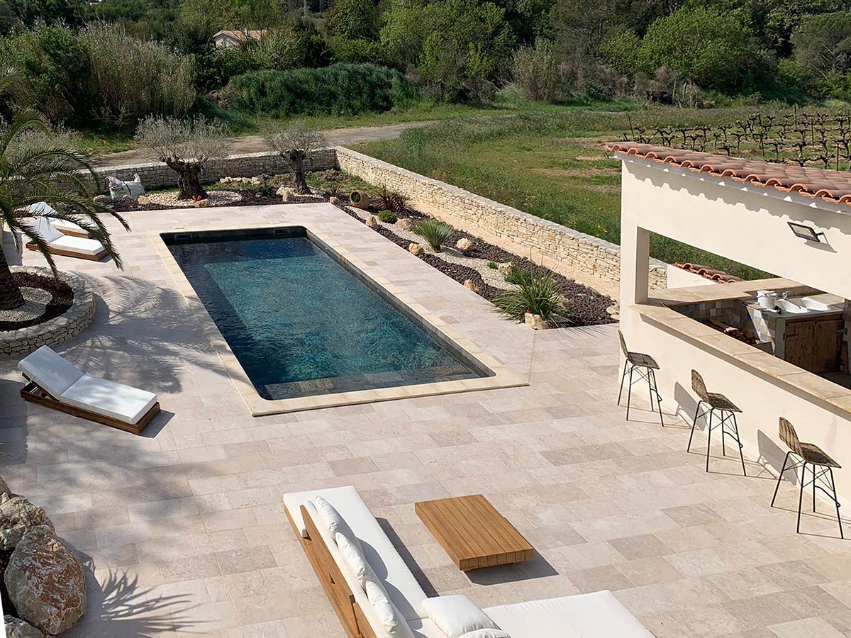 Scoprite questo superbo design per uno spazio esterno contemporaneo e senza tempo, caratterizzato dalla collezione Tiber in travertino. I toni chiari e la texture delicata del travertino creano un’atmosfera rilassante, perfetta per le giornate di sole. Con una piscina, un’ampia terrazza e una cucina estiva, questo spazio è perfetto per godersi le giornate di sole e rinfrescarsi in tutta tranquillità.
